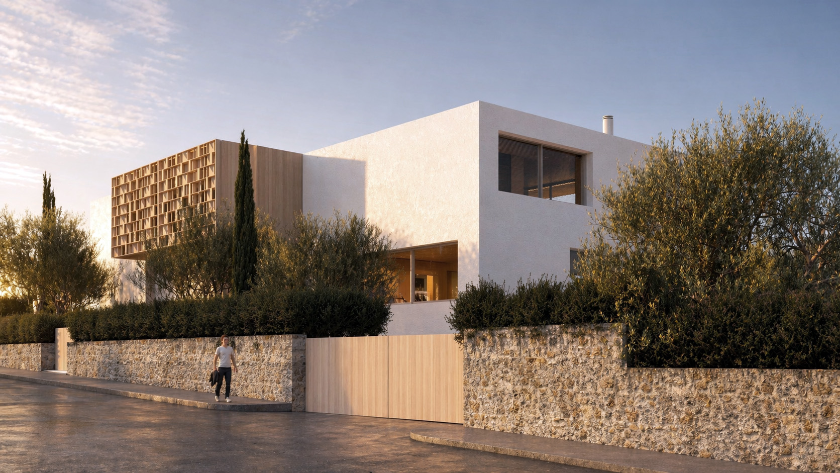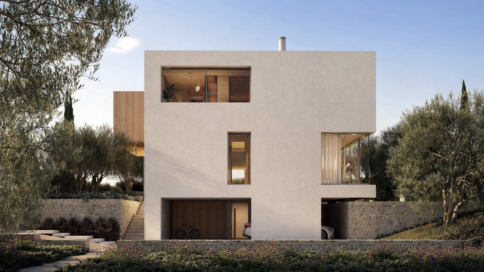 Zeytin ağaçları, lavanta ve düşük bakım gerektiren Akdeniz bitkileriyle kurulan peyzaj, yalnızca görsel bir eşlikçi değil, aynı zamanda yapı ile doğa arasında geçirgen bir eşik oluşturur. Sert ve yumuşak zemin ilişkileriyle tanımlanan bu geçişler, hem yönlendirme hem de mekânsal derinlik sağlar.
